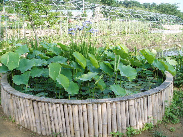 대나무 포장 습지 연못
